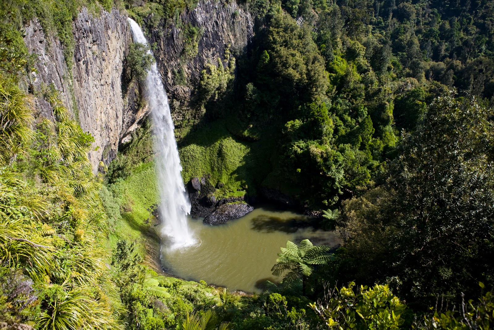 We wanted to see three things along that road from Waitomo to Te Anga. There are caves, a waterfall, and an enormous prehistoric looking natural bridge created by an entire cave system's collapse. This is what you see from above as you wander through some farmer's land:
